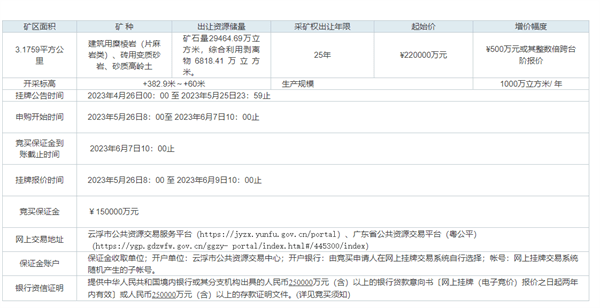 需要關(guān)注的是,當(dāng)?shù)卣疄榻鉀Q礦區(qū)日常生產(chǎn)生活、生產(chǎn)經(jīng)營(yíng)車(chē)輛增多、通行壓力大以及確保石料運(yùn)輸過(guò)程沿線(xiàn)居民出行安全問(wèn)題,并為今后實(shí)現(xiàn)礦地統(tǒng)籌創(chuàng)造條件,須由采礦權(quán)競(jìng)得人負(fù)責(zé)出資建設(shè)礦區(qū)道路,估算總投資40000萬(wàn)元。競(jìng)得人須在簽訂《非油氣采礦權(quán)出讓合同》后,在2023年9月30日前支付第一期款項(xiàng)人民幣20000萬(wàn)元到云浮市云城區(qū)財(cái)政局指定銀行賬戶(hù),第二期在2023年11月30日前繳納剩余款項(xiàng)人民幣20000萬(wàn)元,以支持地方政府進(jìn)行基礎(chǔ)設(shè)施建設(shè)。